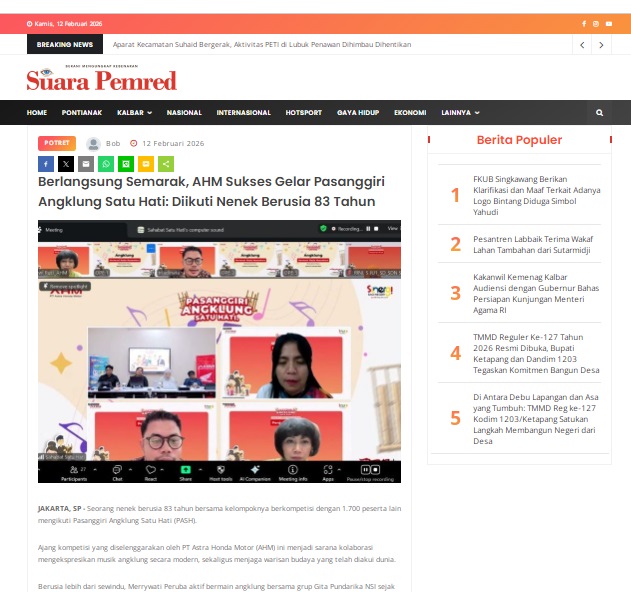 Berlangsung Semarak, AHM Sukses Gelar Pasanggiri Angklung Satu Hati: Diikuti Nenek Berusia 83 Tahun by masmul 12 Februari 2026 in Silahkan kunjungi https://www.suarapemredkalbar.com/read/potret/12022026/berlangsung-semarak-ahm-sukses-gelar-pasanggiri-angklung-satu-hati-diikuti-nenek-berusia-83-tahun. You Might Like Regional Public Launching New ADV160 The SUV Pride Grand Launching New PCX 160 Truly Exceptional! Tetap hati-hati ya bro sist berkendara saat hujan.