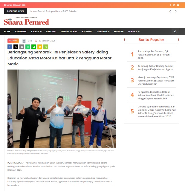 Berlangsung Semarak, InI Penjelasan Safety Riding Education Astra Motor Kalbar untuk Pengguna Motor Matic by masmul 29 Januari 2026 in Silahkan kunjungi https://www.suarapemredkalbar.com/read/potret/29012026/berlangsung-semarak-ini-penjelasan-safety-riding-education-astra-motor-kalbar-untuk-pengguna-motor-matic. You Might Like Regional Public Launching New ADV160 The SUV Pride Grand Launching New PCX 160 Truly Exceptional! Tetap hati-hati ya bro sist berkendara saat hujan.