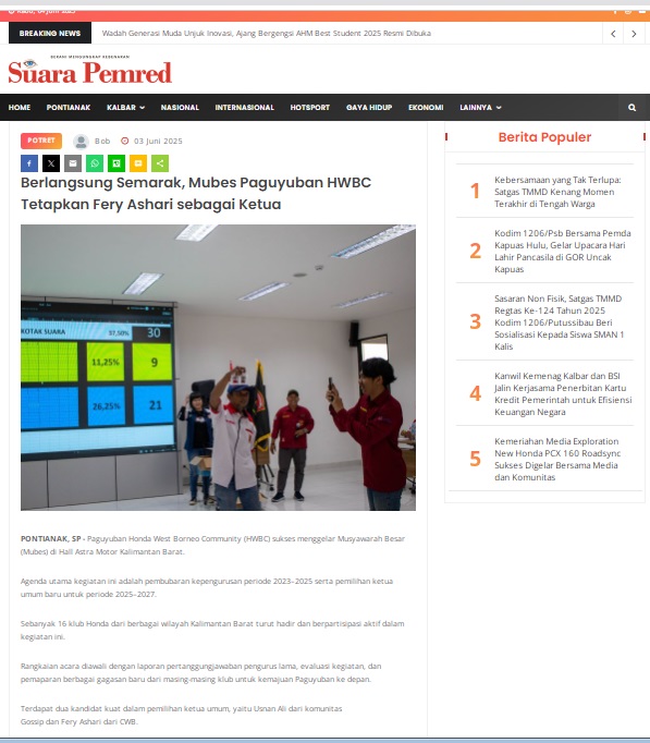 Berlangsung Semarak, Mubes Paguyuban HWBC Tetapkan Fery Ashari sebagai Ketua by masmul 3 Juni 2025 in Silahkan kunjungi https://www.suarapemredkalbar.com/read/potret/03062025/berlangsung-semarak-mubes-paguyuban-hwbc-tetapkan-fery-ashari-sebagai-ketua. You Might Like Regional Public Launching New ADV160 The SUV Pride Grand Launching New PCX 160 Truly Exceptional! Tetap hati-hati ya bro sist berkendara saat hujan.