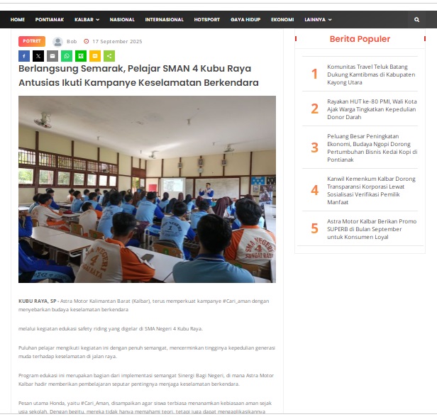Berlangsung Semarak, Pelajar SMAN 4 Kubu Raya Antusias Ikuti Kampanye Keselamatan Berkendara by masmul 17 September 2025 in Silahkan kunjungi https://www.suarapemredkalbar.com/read/potret/17092025/berlangsung-semarak-pelajar-sman-4-kubu-raya-antusias-ikuti-kampanye-keselamatan-berkendara. You Might Like Regional Public Launching New ADV160 The SUV Pride Grand Launching New PCX 160 Truly Exceptional! Tetap hati-hati ya bro sist berkendara saat hujan.