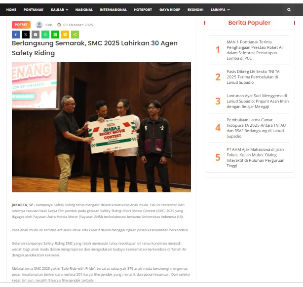 Berlangsung Semarak, SMC 2025 Lahirkan 30 Agen Safety Riding by masmul 9 Oktober 2025 in Silahkan kunjungi https://www.suarapemredkalbar.com/read/potret/09102025/berlangsung-semarak-smc-2025-lahirkan-30-agen-safety-riding. You Might Like Regional Public Launching New ADV160 The SUV Pride Grand Launching New PCX 160 Truly Exceptional! Tetap hati-hati ya bro sist berkendara saat hujan.