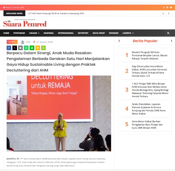Berpacu Dalam Sinergi, Anak Muda Rasakan Pengalaman Berbeda Gerakan Satu Hari Menjalankan Gaya Hidup Sustainable Living dengan Praktek Decluttering dari AHM by masmul 21 Januari 2026 in Silahkan kunjungi https://www.suarapemredkalbar.com/read/potret/21012026/berpacu-dalam-sinergi-anak-muda-rasakan-pengalaman-berbeda-gerakan-satu-hari-menjalankan-gaya-hidup-sustainable-living-dengan-praktek-decluttering-dari-ahm. You Might Like Regional Public Launching New ADV160 The SUV Pride Grand Launching New PCX 160 Truly Exceptional! Tetap hati-hati ya bro sist berkendara saat hujan.