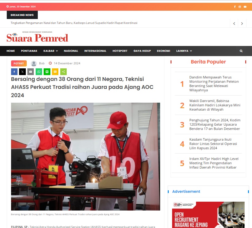 Bersaing dengan 38 Orang dari 11 Negara, Teknisi AHASS Perkuat Tradisi raihan Juara pada Ajang AOC 2024 by masmul 14 Desember 2024 in Silahkan kunjungi https://www.suarapemredkalbar.com/read/potret/14122024/bersaing-dengan-38-orang-dari-11-negara-teknisi-ahass-perkuat-tradisi-raihan-juara-pada-ajang-aoc-2024. You Might Like Regional Public Launching New ADV160 The SUV Pride Grand Launching New PCX 160 Truly Exceptional! Tetap hati-hati ya bro sist berkendara saat hujan.