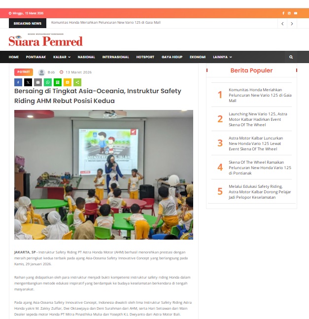 Bersaing di Tingkat Asia-Oceania, Instruktur Safety Riding AHM Rebut Posisi Kedua by masmul 13 Maret 2026 in Silahkan kunjungi https://www.suarapemredkalbar.com/read/potret/13032026/bersaing-di-tingkat-asia-oceania-instruktur-safety-riding-ahm-rebut-posisi-kedua. You Might Like Regional Public Launching New ADV160 The SUV Pride Grand Launching New PCX 160 Truly Exceptional! Tetap hati-hati ya bro sist berkendara saat hujan.