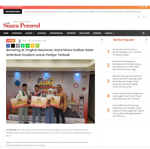 Bersaing di Tingkat Nasional, Astra Motor Kalbar Gelar AHM Best Student untuk Pelajar Terbaik by masmul 29 Oktober 2025 in Silahkan kunjungi https://www.suarapemredkalbar.com/read/potret/29102025/bersaing-di-tingkat-nasional-astra-motor-kalbar-gelar-ahm-best-student-untuk-pelajar-terbaik. You Might Like Regional Public Launching New ADV160 The SUV Pride Grand Launching New PCX 160 Truly Exceptional! Tetap hati-hati ya bro sist berkendara saat hujan.