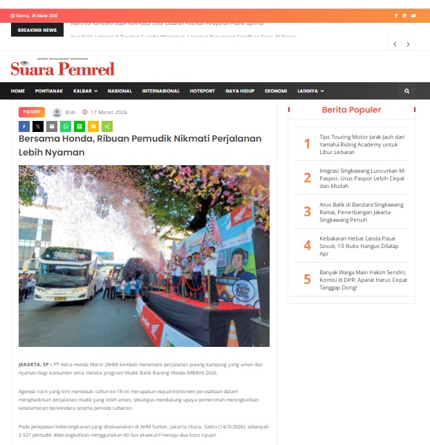 Bersama Honda, Ribuan Pemudik Nikmati Perjalanan Lebih Nyaman by masmul 17 Maret 2026 in Silahkan kunjungi https://www.suarapemredkalbar.com/read/potret/17032026/bersama-honda-ribuan-pemudik-nikmati-perjalanan-lebih-nyaman. You Might Like Regional Public Launching New ADV160 The SUV Pride Grand Launching New PCX 160 Truly Exceptional! Tetap hati-hati ya bro sist berkendara saat hujan.