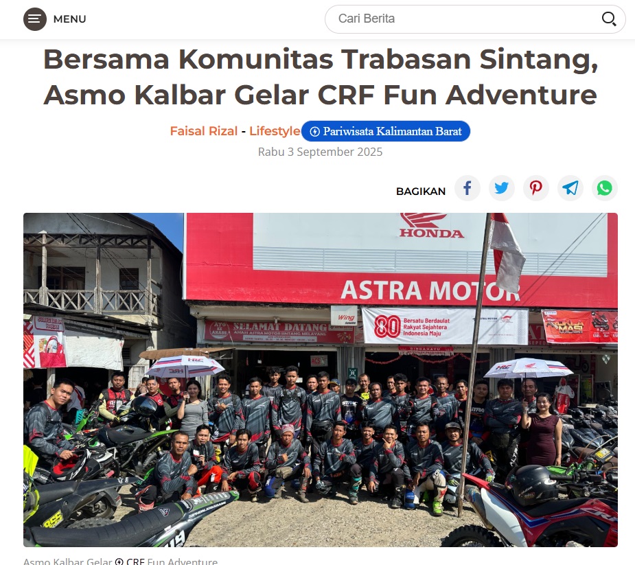 Bersama Komunitas Trabasan Sintang, Asmo Kalbar Gelar CRF Fun Adventure by Dodi Dodi 3 September 2025 in Silahkan kunjungi https://harianberkat.com/2025/09/03/bersama-komunitas-trabasan-sintang-asmo-kalbar-gelar-crf-fun-adventure/. You Might Like Regional Public Launching New ADV160 The SUV Pride Grand Launching New PCX 160 Truly Exceptional! Tetap hati-hati ya bro sist berkendara saat hujan.