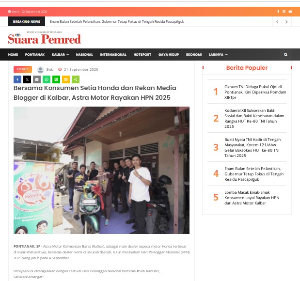 Bersama Konsumen Setia Honda dan Rekan Media Blogger di Kalbar, Astra Motor Rayakan HPN 2025 by masmul 21 September 2025 in Silahkan kunjungi https://www.suarapemredkalbar.com/read/potret/21092025/bersama-konsumen-setia-honda-dan-rekan-media-blogger-di-kalbar-astra-motor-rayakan-hpn-2025. You Might Like Regional Public Launching New ADV160 The SUV Pride Grand Launching New PCX 160 Truly Exceptional! Tetap hati-hati ya bro sist berkendara saat hujan.