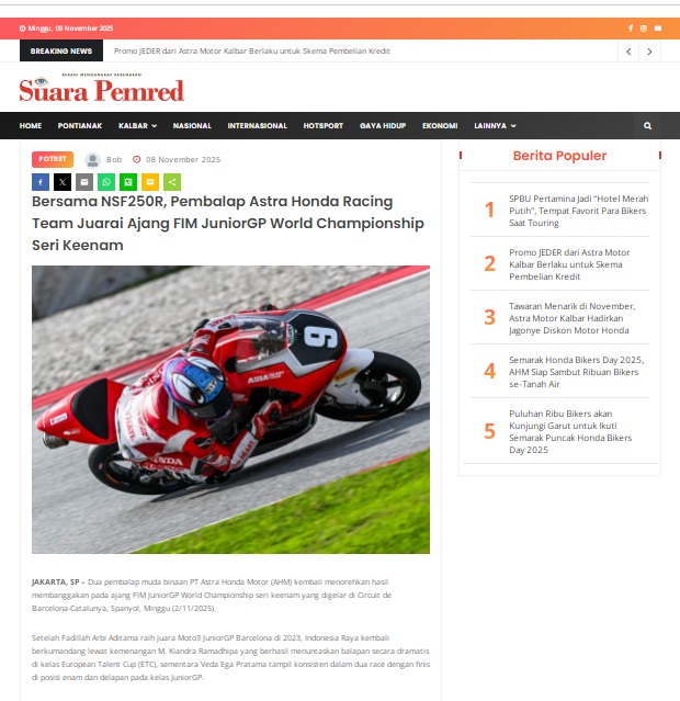 Bersama NSF250R, Pembalap Astra Honda Racing Team Juarai Ajang FIM JuniorGP World Championship Seri Keenam by masmul 8 November 2025 in Silahkan kunjungi https://www.suarapemredkalbar.com/read/potret/08112025/bersama-nsf250r-pembalap-astra-honda-racing-team-juarai-ajang-fim-juniorgp-world-championship-seri-keenam. You Might Like Regional Public Launching New ADV160 The SUV Pride Grand Launching New PCX 160 Truly Exceptional! Tetap hati-hati ya bro sist berkendara saat hujan.