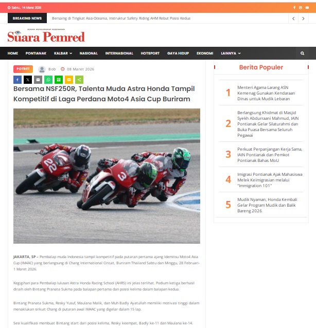 Bersama NSF250R, Talenta Muda Astra Honda Tampil Kompetitif di Laga Perdana Moto4 Asia Cup Buriram by masmul 8 Maret 2026 in Silahkan kunjungi https://www.suarapemredkalbar.com/read/potret/08032026/bersama-nsf250r-talenta-muda-astra-honda-tampil-kompetitif-di-laga-perdana-moto4-asia-cup-buriram. You Might Like Regional Public Launching New ADV160 The SUV Pride Grand Launching New PCX 160 Truly Exceptional! Tetap hati-hati ya bro sist berkendara saat hujan.