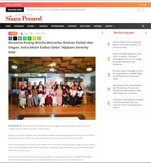 Bersama Ruang Wanita Bercerita: Berikan Stylish dan Elegan, Astra Motor Kalbar Gelar “Hijabers Serenity Ride” by masmul 17 April 2026 in Silahkan kunjungi https://www.suarapemredkalbar.com/read/potret/17042026/bersama-ruang-wanita-bercerita-berikan-stylish-dan-elegan-astra-motor-kalbar-gelar-hijabers-serenity-ride. You Might Like Regional Public Launching New ADV160 The SUV Pride Grand Launching New PCX 160 Truly Exceptional! Tetap hati-hati ya bro sist berkendara saat hujan.