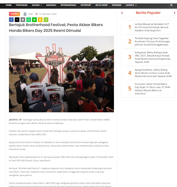 Bertajuk Brotherhood Festival, Pesta Akbar Bikers Honda Bikers Day 2025 Resmi Dimulai by masmul 13 Oktober 2025 in Silahkan kunjungi https://www.suarapemredkalbar.com/read/potret/13102025/bertajuk-brotherhood-festival-pesta-akbar-bikers-honda-bikers-day-2025-resmi-dimulai. You Might Like Regional Public Launching New ADV160 The SUV Pride Grand Launching New PCX 160 Truly Exceptional! Tetap hati-hati ya bro sist berkendara saat hujan.