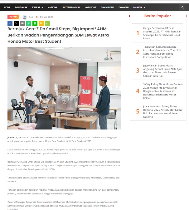 Bertajuk Gen-Z Do Small Steps, Big Impact! AHM Berikan Wadah Pengembangan SDM Lewat Astra Honda Motor Best Student by masmul 3 Juli 2025 in Silahkan kunjungi https://www.suarapemredkalbar.com/read/potret/03072025/bertajuk-gen-z-do-small-steps-big-impact-ahm-berikan-wadah-pengembangan-sdm-lewat-astra-honda-motor-best-student. You Might Like Regional Public Launching New ADV160 The SUV Pride Grand Launching New PCX 160 Truly Exceptional! Tetap hati-hati ya bro sist berkendara saat hujan.