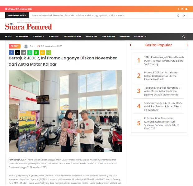 Bertajuk JEDER, Ini Promo Jagonye Diskon November dari Astra Motor Kalbar by masmul 8 November 2025 in Silahkan kunjungi https://www.suarapemredkalbar.com/read/potret/08112025/bertajuk-jeder-ini-promo-jagonye-diskon-november-dari-astra-motor-kalbar. You Might Like Regional Public Launching New ADV160 The SUV Pride Grand Launching New PCX 160 Truly Exceptional! Tetap hati-hati ya bro sist berkendara saat hujan.