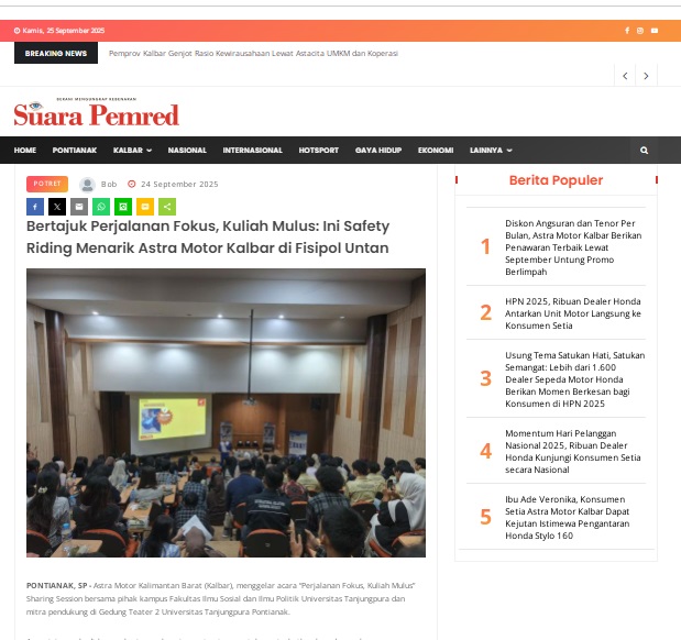 Bertajuk Perjalanan Fokus, Kuliah Mulus: Ini Safety Riding Menarik Astra Motor Kalbar di Fisipol Untan by masmul 24 September 2025 in Silahkan kunjungi https://www.suarapemredkalbar.com/read/potret/24092025/bertajuk-perjalanan-fokus-kuliah-mulus-ini-safety-riding-menarik-astra-motor-kalbar-di-fisipol-untan. You Might Like Regional Public Launching New ADV160 The SUV Pride Grand Launching New PCX 160 Truly Exceptional! Tetap hati-hati ya bro sist berkendara saat hujan.