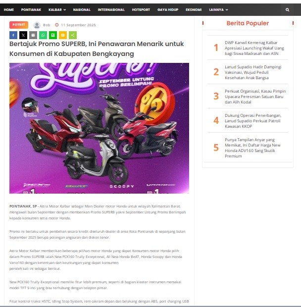 Bertajuk Promo SUPERB, Ini Penawaran Menarik untuk Konsumen di Kabupaten Bengkayang by masmul 11 September 2025 in Silahkan kunjungi https://www.suarapemredkalbar.com/read/potret/11092025/bertajuk-promo-superb-ini-penawaran-menarik-untuk-konsumen-di-kabupaten-bengkayang. You Might Like Regional Public Launching New ADV160 The SUV Pride Grand Launching New PCX 160 Truly Exceptional! Tetap hati-hati ya bro sist berkendara saat hujan.