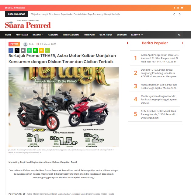 Bertajuk Promo TEHAER, Astra Motor Kalbar Manjakan Konsumen dengan Diskon Tenor dan Cicilan Terbaik by masmul 26 Maret 2026 in Silahkan kunjungi https://www.suarapemredkalbar.com/read/potret/26032026/bertajuk-promo-tehaer-astra-motor-kalbar-manjakan-konsumen-dengan-diskon-tenor-dan-cicilan-terbaik. You Might Like Regional Public Launching New ADV160 The SUV Pride Grand Launching New PCX 160 Truly Exceptional! Tetap hati-hati ya bro sist berkendara saat hujan.