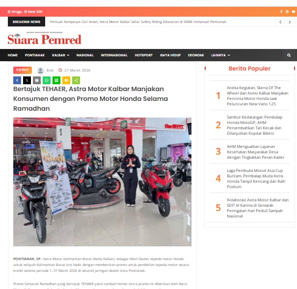 Bertajuk TEHAER, Astra Motor Kalbar Manjakan Konsumen dengan Promo Motor Honda Selama Ramadhan by masmul 27 Maret 2026 in Silahkan kunjungi https://www.suarapemredkalbar.com/read/potret/27032026/bertajuk-tehaer-astra-motor-kalbar-manjakan-konsumen-dengan-promo-motor-honda-selama-ramadhan. You Might Like Regional Public Launching New ADV160 The SUV Pride Grand Launching New PCX 160 Truly Exceptional! Tetap hati-hati ya bro sist berkendara saat hujan.