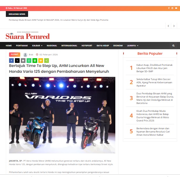 Bertajuk Time To Step Up, AHM Luncurkan All New Honda Vario 125 dengan Pembaharuan Menyeluruh by masmul 2 Februari 2026 in Silahkan kunjungi https://www.suarapemredkalbar.com/read/potret/02022026/bertajuk-time-to-step-up-ahm-luncurkan-all-new-honda-vario-125-dengan-pembaharuan-menyeluruh. You Might Like Regional Public Launching New ADV160 The SUV Pride Grand Launching New PCX 160 Truly Exceptional! Tetap hati-hati ya bro sist berkendara saat hujan.