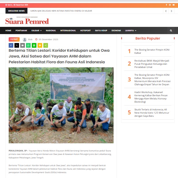 Bertema Titian Lestari: Koridor Kehidupan untuk Owa Jawa, Aksi Satwa dari Yayasan AHM dalam Pelestarian Habitat Flora dan Fauna Asli Indonesia by masmul 5 Desember 2025 in Silahkan kunjungi https://www.suarapemredkalbar.com/read/potret/05122025/bertema-titian-lestari-koridor-kehidupan-untuk-owa-jawa-aksi-satwa-dari-yayasan-ahm-dalam-pelestarian-habitat-flora-dan-fauna-asli-indonesia. You Might Like Regional Public Launching New ADV160 The SUV Pride Grand Launching New PCX 160 Truly Exceptional! Tetap hati-hati ya bro sist berkendara saat hujan.