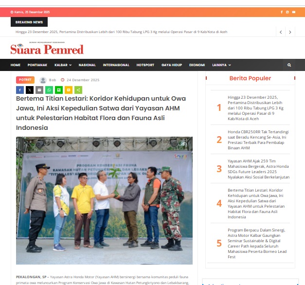 Bertema Titian Lestari: Koridor Kehidupan untuk Owa Jawa, Ini Aksi Kepedulian Satwa dari Yayasan AHM untuk Pelestarian Habitat Flora dan Fauna Asli Indonesia by masmul 24 Desember 2025 in Silahkan kunjungi https://www.suarapemredkalbar.com/read/potret/24122025/bertema-titian-lestari-koridor-kehidupan-untuk-owa-jawa-ini-aksi-kepedulian-satwa-dari-yayasan-ahm-untuk-pelestarian-habitat-flora-dan-fauna-asli-indonesia. You Might Like Regional Public Launching New ADV160 The SUV Pride Grand Launching New PCX 160 Truly Exceptional! Tetap hati-hati ya bro sist berkendara saat hujan.