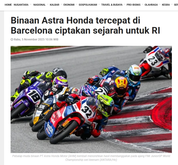 Binaan Astra Honda tercepat di Barcelona ciptakan sejarah untuk RI by Dedi 5 November 2025 in Silahkan kunjungi https://kalbar.antaranews.com/berita/672493/binaan-astra-honda-tercepat-di-barcelona-ciptakan-sejarah-untuk-ri. You Might Like Regional Public Launching New ADV160 The SUV Pride Grand Launching New PCX 160 Truly Exceptional! Tetap hati-hati ya bro sist berkendara saat hujan.