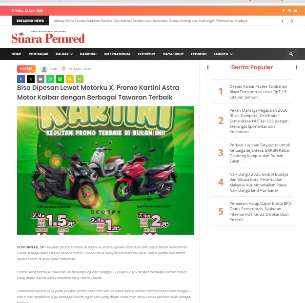 Bisa Dipesan Lewat Motorku X, Promo Kartini Astra Motor Kalbar dengan Berbagai Tawaran Terbaik by masmul 18 April 2026 in Silahkan kunjungi https://www.suarapemredkalbar.com/read/potret/18042026/bisa-dipesan-lewat-motorku-x-promo-kartini-astra-motor-kalbar-dengan-berbagai-tawaran-terbaik. You Might Like Regional Public Launching New ADV160 The SUV Pride Grand Launching New PCX 160 Truly Exceptional! Tetap hati-hati ya bro sist berkendara saat hujan.