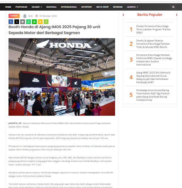 Booth Honda di Ajang IMOS 2025 Pajang 30 unit Sepeda Motor dari Berbagai Segmen by masmul 18 Oktober 2025 in Silahkan kunjungi https://www.suarapemredkalbar.com/read/potret/18102025/booth-honda-di-ajang-imos-2025-pajang-30-unit-sepeda-motor-dari-berbagai-segmen. You Might Like Regional Public Launching New ADV160 The SUV Pride Grand Launching New PCX 160 Truly Exceptional! Tetap hati-hati ya bro sist berkendara saat hujan.
