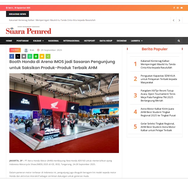 Booth Honda di Arena IMOS jadi Sasaran Pengunjung untuk Saksikan Produk-Produk Terbaik AHM by masmul 29 September 2025 in Silahkan kunjungi https://www.suarapemredkalbar.com/read/potret/29092025/booth-honda-di-arena-imos-jadi-sasaran-pengunjung-untuk-saksikan-produk-produk-terbaik-ahm. You Might Like Grand Launching New PCX 160 Truly Exceptional! Tetap hati-hati ya bro sist berkendara saat hujan. Persiapkan Motormu Sebelum Mudik