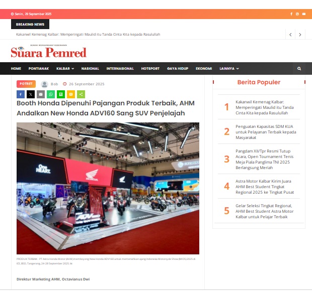 Booth Honda Dipenuhi Pajangan Produk Terbaik, AHM Andalkan New Honda ADV160 Sang SUV Penjelajah by masmul 26 September 2025 in Silahkan kunjungi https://www.suarapemredkalbar.com/read/potret/26092025/booth-honda-dipenuhi-pajangan-produk-terbaik-ahm-andalkan-new-honda-adv160-sang-suv-penjelajah. You Might Like Regional Public Launching New ADV160 The SUV Pride Grand Launching New PCX 160 Truly Exceptional! Tetap hati-hati ya bro sist berkendara saat hujan.