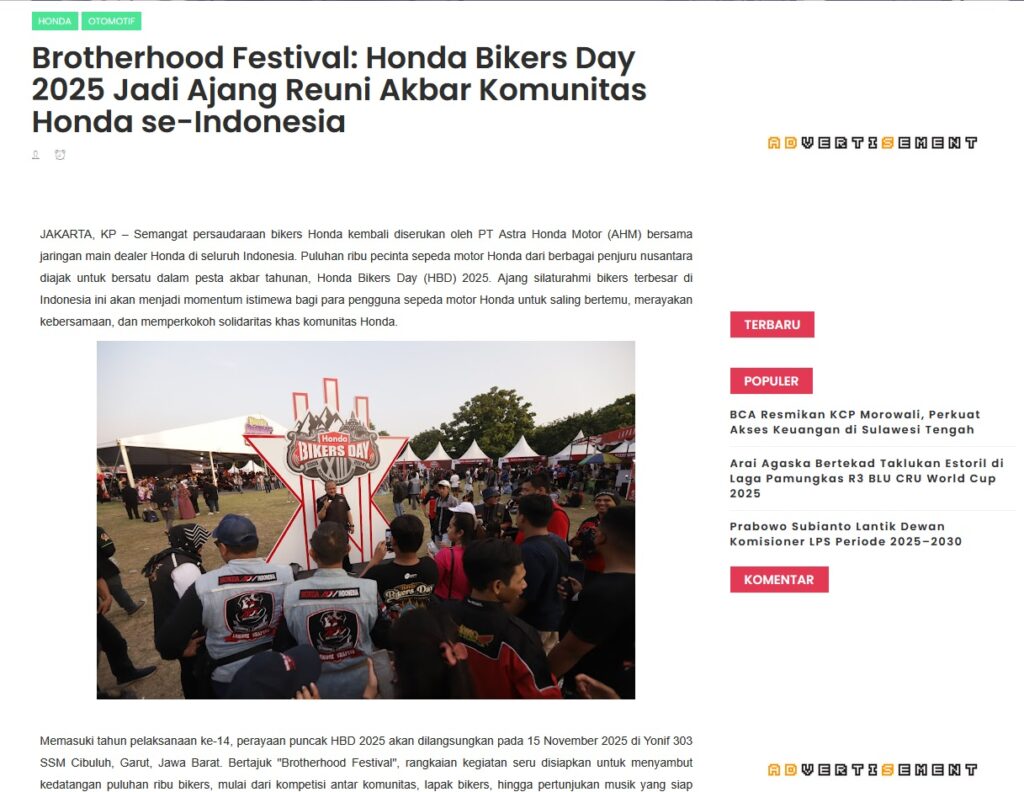 Brotherhood Festival: Honda Bikers Day 2025 Jadi Ajang Reuni Akbar Komunitas Honda se-Indonesia by Muhammad Arif 6 Oktober 2025 in Silahkan kunjungi https://www.kapuaspost.web.id/2025/10/brotherhood-festival-honda-bikers-day.html. Tags: astra Astra Motor kalbar Astra Motor Pontianak astramotor honda kalbar pontianak sepeda motor You Might Like Regional Public Launching New ADV160 The SUV Pride Grand Launching New PCX 160 Truly Exceptional! Tetap hati-hati ya bro sist berkendara saat hujan.