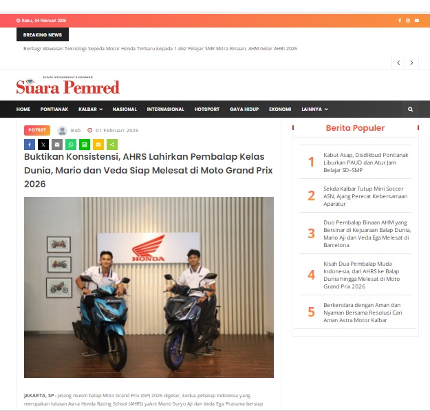 Buktikan Konsistensi, AHRS Lahirkan Pembalap Kelas Dunia, Mario dan Veda Siap Melesat di Moto Grand Prix 2026 by masmul 1 Februari 2026 in Silahkan kunjungi https://www.suarapemredkalbar.com/read/potret/01022026/buktikan-konsistensi-ahrs-lahirkan-pembalap-kelas-dunia-mario-dan-veda-siap-melesat-di-moto-grand-prix-2026. You Might Like Regional Public Launching New ADV160 The SUV Pride Grand Launching New PCX 160 Truly Exceptional! Tetap hati-hati ya bro sist berkendara saat hujan.