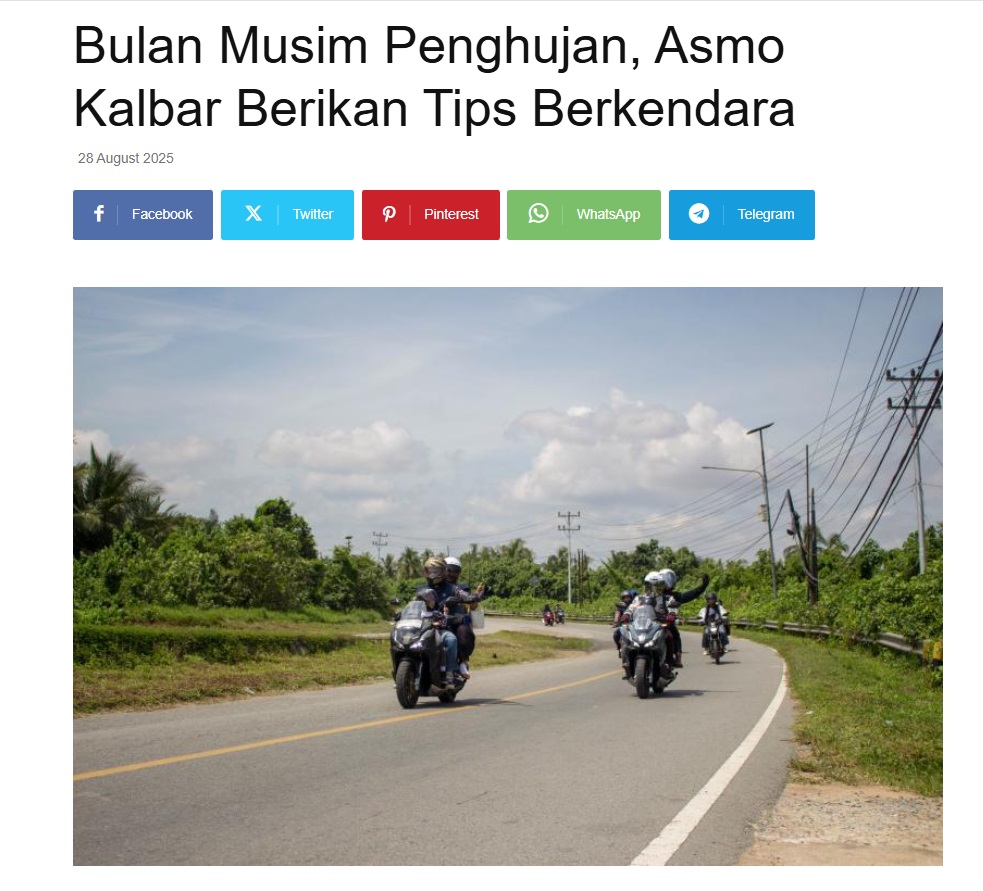 Bulan Musim Penghujan, Asmo Kalbar Berikan Tips Berkendara by Nova Sari 28 Agustus 2025 in Silahkan kunjungi https://equator.co.id/bulan-musim-penghujan-asmo-kalbar-berikan-tips-berkendara/. You Might Like Regional Public Launching New ADV160 The SUV Pride Grand Launching New PCX 160 Truly Exceptional! Tetap hati-hati ya bro sist berkendara saat hujan.