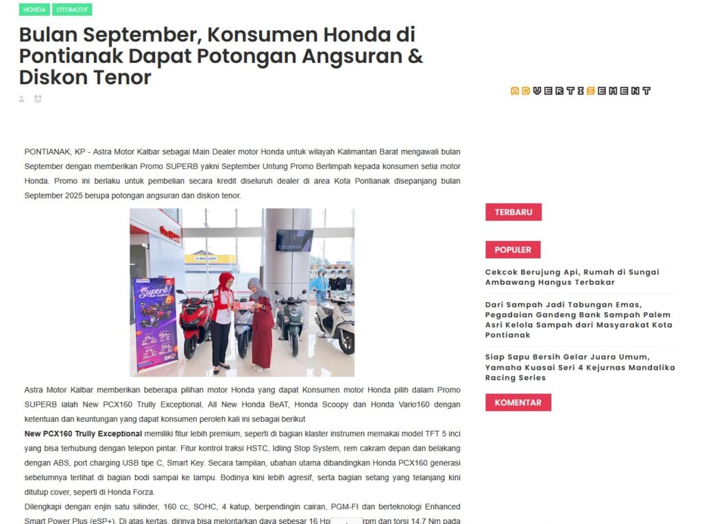Bulan September, Konsumen Honda di Pontianak Dapat Potongan Angsuran & Diskon Tenor by Muhammad Arif 28 September 2025 in Silahkan kunjungi https://www.kapuaspost.web.id/2025/09/bulan-september-konsumen-honda-di_29.html. Tags: astra Astra Motor kalbar Astra Motor Pontianak astramotor honda kalbar pontianak sepeda motor You Might Like Regional Public Launching New ADV160 The SUV Pride Grand Launching New PCX 160 Truly Exceptional! Tetap hati-hati ya bro sist berkendara saat hujan.