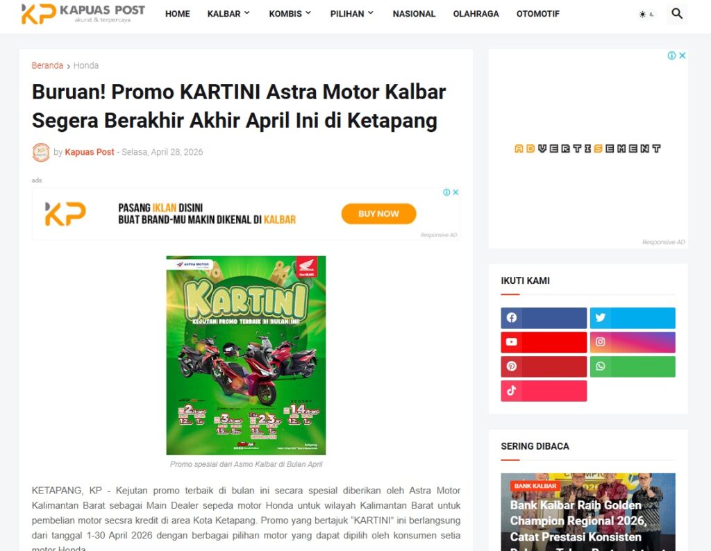 Buruan! Promo KARTINI Astra Motor Kalbar Segera Berakhir Akhir April Ini di Ketapang by Muhammad Arif 28 April 2026 in Silahkan kunjungi https://www.kapuaspost.web.id/2026/04/buruan-promo-kartini-astra-motor-kalbar.html. Tags: astra Astra Motor kalbar Astra Motor Pontianak astramotor honda kalbar pontianak sepeda motor You Might Like Regional Public Launching New ADV160 The SUV Pride Grand Launching New PCX 160 Truly Exceptional! Tetap hati-hati ya bro sist berkendara saat hujan.