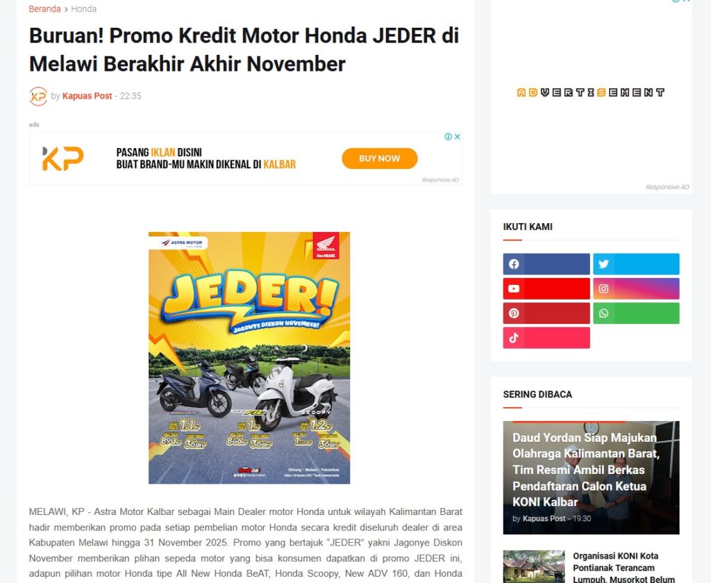 Buruan! Promo Kredit Motor Honda JEDER di Melawi Berakhir Akhir November by Muhammad Arif 27 November 2025 in Silahkan kunjungi https://www.kapuaspost.web.id/2025/11/buruan-promo-kredit-motor-honda-jeder.html. Tags: astra Astra Motor kalbar Astra Motor Pontianak astramotor honda kalbar pontianak sepeda motor You Might Like Regional Public Launching New ADV160 The SUV Pride Grand Launching New PCX 160 Truly Exceptional! Tetap hati-hati ya bro sist berkendara saat hujan.