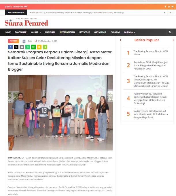 Semarak Program Berpacu Dalam Sinergi, Astra Motor Kalbar Sukses Gelar Decluttering Mission dengan tema Sustainable Living Bersama Jurnalis Media dan Blogger by masmul 5 Desember 2025 in Silahkan kunjungi https://www.suarapemredkalbar.com/read/potret/05122025/semarak-program-berpacu-dalam-sinergi-astra-motor-kalbar-sukses-gelar-decluttering-mission-dengan-tema-sustainable-living-bersama-jurnalis-media-dan-blogger. You Might Like Regional Public Launching New ADV160 The SUV Pride Grand Launching New PCX 160 Truly Exceptional! Tetap hati-hati ya bro sist berkendara saat hujan.