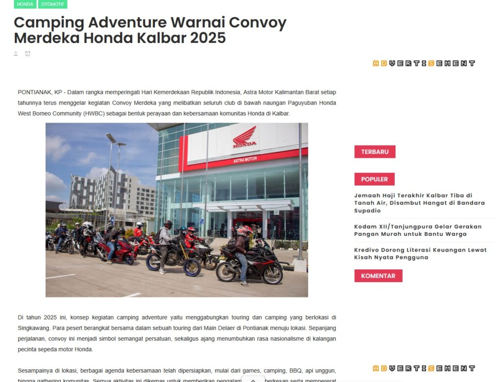 Camping Adventure Warnai Convoy Merdeka Honda Kalbar 2025 by Muhammad Arif 4 September 2025 in Silahkan kunjungi https://www.kapuaspost.web.id/2025/09/camping-adventure-warnai-convoy-merdeka.html. Tags: astra Astra Motor kalbar Astra Motor Pontianak astramotor honda kalbar pontianak sepeda motor You Might Like Regional Public Launching New ADV160 The SUV Pride Grand Launching New PCX 160 Truly Exceptional! Tetap hati-hati ya bro sist berkendara saat hujan.