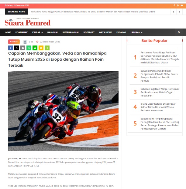 Capaian Membanggakan, Veda dan Ramadhipa Tutup Musim 2025 di Eropa dengan Raihan Poin Terbaik by masmul 22 Desember 2025 in Silahkan kunjungi https://www.suarapemredkalbar.com/read/potret/22122025/capaian-membanggakan-veda-dan-ramadhipa-tutup-musim-2025-di-eropa-dengan-raihan-poin-terbaik. You Might Like Regional Public Launching New ADV160 The SUV Pride Grand Launching New PCX 160 Truly Exceptional! Tetap hati-hati ya bro sist berkendara saat hujan.