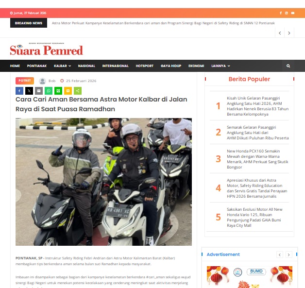 Cara Cari Aman Bersama Astra Motor Kalbar di Jalan Raya di Saat Puasa Ramadhan by masmul 25 Februari 2026 in Silahkan kunjungi https://www.suarapemredkalbar.com/read/potret/25022026/cara-cari-aman-bersama-astra-motor-kalbar-di-jalan-raya-di-saat-puasa-ramadhan. You Might Like Regional Public Launching New ADV160 The SUV Pride Grand Launching New PCX 160 Truly Exceptional! Tetap hati-hati ya bro sist berkendara saat hujan.