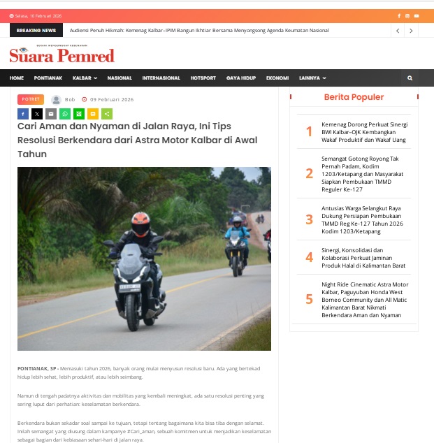 Cari Aman dan Nyaman di Jalan Raya, Ini Tips Resolusi Berkendara dari Astra Motor Kalbar di Awal Tahun by masmul 9 Februari 2026 in Silahkan kunjungi https://www.suarapemredkalbar.com/read/potret/09022026/cari-aman-dan-nyaman-di-jalan-raya-ini-tips-resolusi-berkendara-dari-astra-motor-kalbar-di-awal-tahun. You Might Like Regional Public Launching New ADV160 The SUV Pride Grand Launching New PCX 160 Truly Exceptional! Tetap hati-hati ya bro sist berkendara saat hujan.