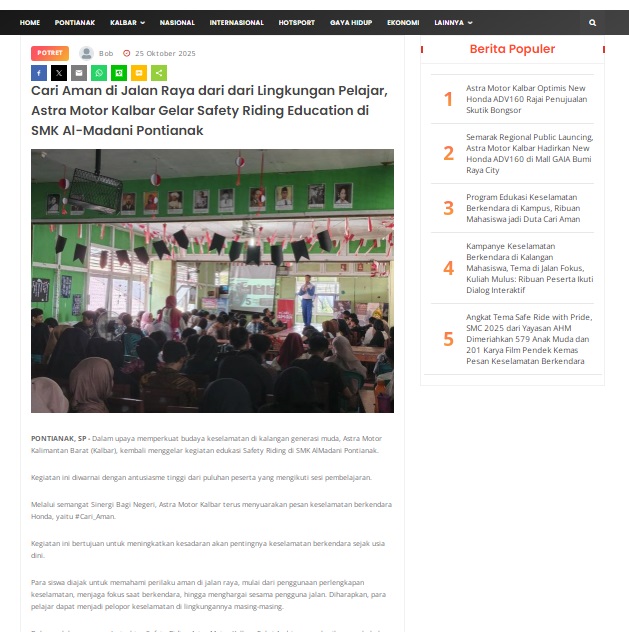 Cari Aman di Jalan Raya dari dari Lingkungan Pelajar, Astra Motor Kalbar Gelar Safety Riding Education di SMK Al-Madani Pontianak by masmul 25 Oktober 2025 in Silahkan kunjungi https://www.suarapemredkalbar.com/read/potret/25102025/cari-aman-di-jalan-raya-dari-dari-lingkungan-pelajar-astra-motor-kalbar-gelar-safety-riding-education-di-smk-al-madani-pontianak. You Might Like Regional Public Launching New ADV160 The SUV Pride Grand Launching New PCX 160 Truly Exceptional! Tetap hati-hati ya bro sist berkendara saat hujan.