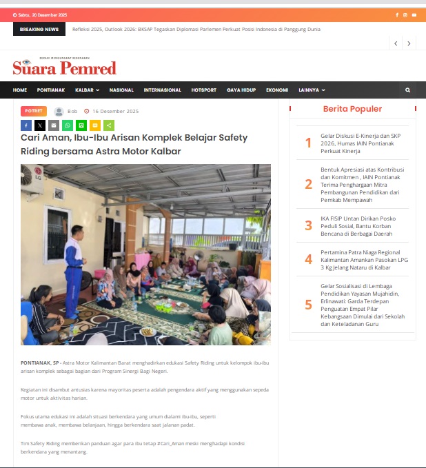 Cari Aman, Ibu-Ibu Arisan Komplek Belajar Safety Riding bersama Astra Motor Kalbar by masmul 16 Desember 2025 in Silahkan kunjungi https://www.suarapemredkalbar.com/read/potret/16122025/cari-aman-ibu-ibu-arisan-komplek-belajar-safety-riding-bersama-astra-motor-kalbar. You Might Like Regional Public Launching New ADV160 The SUV Pride Grand Launching New PCX 160 Truly Exceptional! Tetap hati-hati ya bro sist berkendara saat hujan.