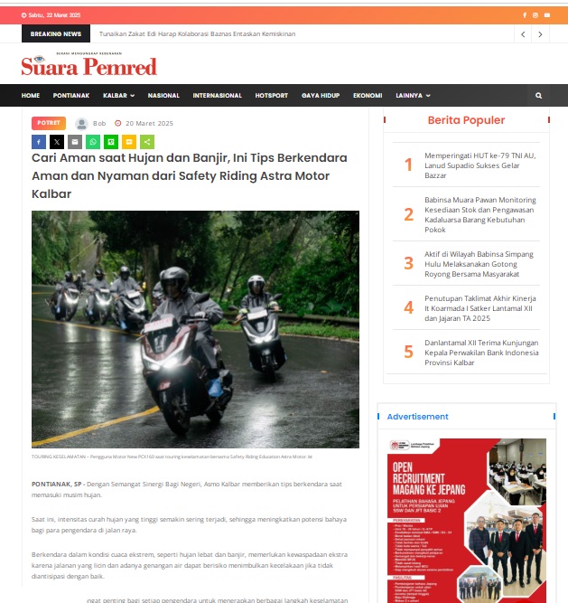 Cari Aman saat Hujan dan Banjir, Ini Tips Berkendara Aman dan Nyaman dari Safety Riding Astra Motor Kalbar by masmul 20 Maret 2025 in Silahkan kunjungi https://www.suarapemredkalbar.com/read/potret/20032025/cari-aman-saat-hujan-dan-banjir-ini-tips-berkendara-aman-dan-nyaman-dari-safety-riding-astra-motor-kalbar. You Might Like Regional Public Launching New ADV160 The SUV Pride Grand Launching New PCX 160 Truly Exceptional! Tetap hati-hati ya bro sist berkendara saat hujan.