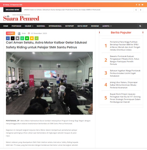 Cari Aman Selalu, Astra Motor Kalbar Gelar Edukasi Safety Riding untuk Pelajar SMA Santu Petrus by masmul 22 Desember 2025 in Silahkan kunjungi https://www.suarapemredkalbar.com/read/potret/22122025/cari-aman-selalu-astra-motor-kalbar-gelar-edukasi-safety-riding-untuk-pelajar-sma-santu-petrus. You Might Like Regional Public Launching New ADV160 The SUV Pride Grand Launching New PCX 160 Truly Exceptional! Tetap hati-hati ya bro sist berkendara saat hujan.