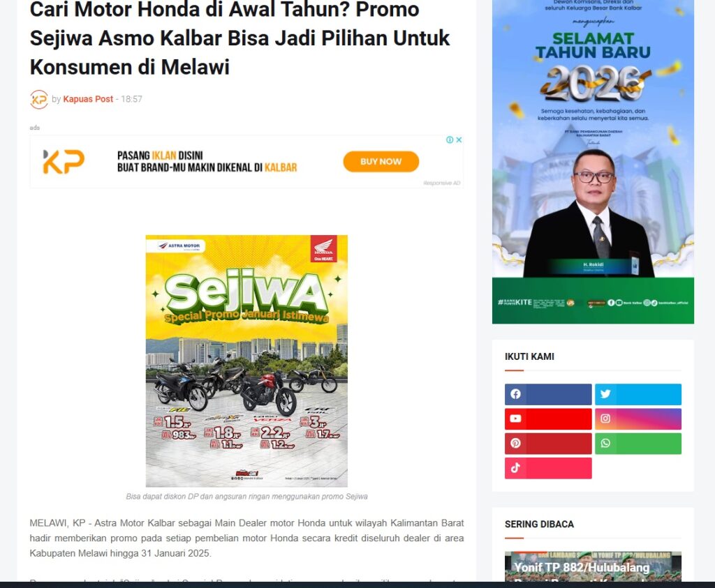 Cari Motor Honda di Awal Tahun? Promo Sejiwa Asmo Kalbar Bisa Jadi Pilihan Untuk Konsumen di Melawi by Muhammad Arif 16 Januari 2026 in Silahkan kunjungi https://www.kapuaspost.web.id/2026/01/cari-motor-honda-di-awal-tahun-promo.html. Tags: astra Astra Motor kalbar Astra Motor Pontianak astramotor honda kalbar pontianak sepeda motor You Might Like Regional Public Launching New ADV160 The SUV Pride Grand Launching New PCX 160 Truly Exceptional! Tetap hati-hati ya bro sist berkendara saat hujan.