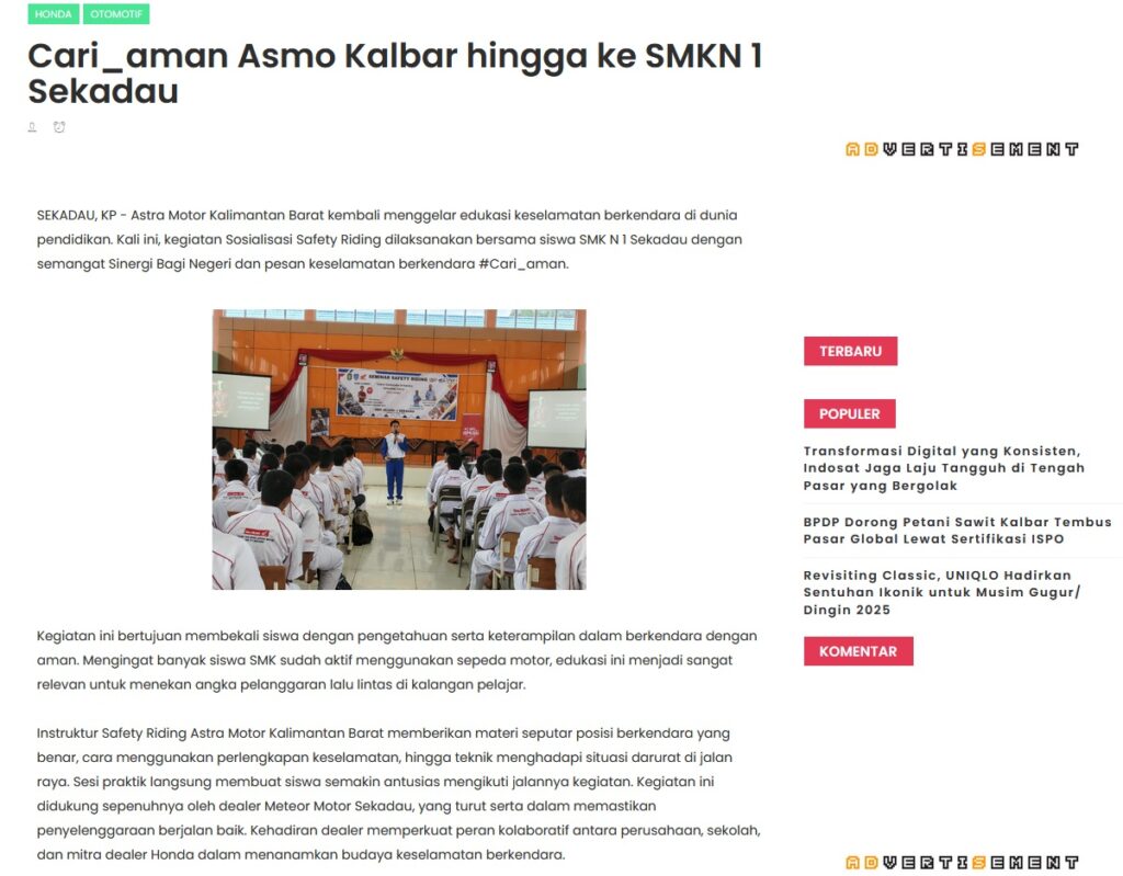 Cari_aman Asmo Kalbar hingga ke SMKN 1 Sekadau by Muhammad Arif 22 Agustus 2025 in Silahkan kunjungi https://www.kapuaspost.web.id/2025/08/cariaman-asmo-kalbar-hingga-ke-smkn-1.html. Tags: astra Astra Motor kalbar Astra Motor Pontianak astramotor honda kalbar pontianak sepeda motor You Might Like Regional Public Launching New ADV160 The SUV Pride Grand Launching New PCX 160 Truly Exceptional! Tetap hati-hati ya bro sist berkendara saat hujan.