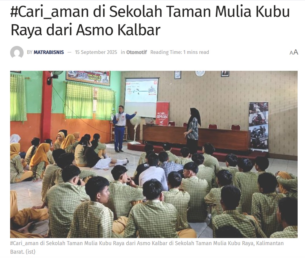 #Cari_aman di Sekolah Taman Mulia Kubu Raya dari Asmo Kalbar by Sri Yuliantiningsih 15 September 2025 in Silahkan kunjungi https://matrabisnis.id/2025/09/15/cari_aman-di-sekolah-taman-mulia-kubu-raya-dari-asmo-kalbar/. You Might Like Regional Public Launching New ADV160 The SUV Pride Grand Launching New PCX 160 Truly Exceptional! Tetap hati-hati ya bro sist berkendara saat hujan.
