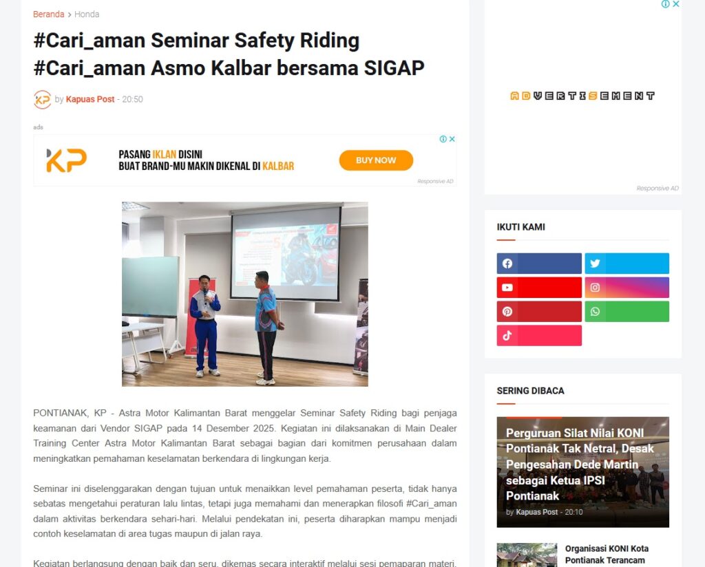 #Cari_aman Seminar Safety Riding #Cari_aman Asmo Kalbar bersama SIGAP by Muhammad Arif 20 Desember 2025 in Silahkan kunjungi https://www.kapuaspost.web.id/2025/12/cariaman-seminar-safety-riding-cariaman.html. Tags: astra Astra Motor kalbar Astra Motor Pontianak astramotor honda kalbar pontianak sepeda motor You Might Like Regional Public Launching New ADV160 The SUV Pride Grand Launching New PCX 160 Truly Exceptional! Tetap hati-hati ya bro sist berkendara saat hujan.