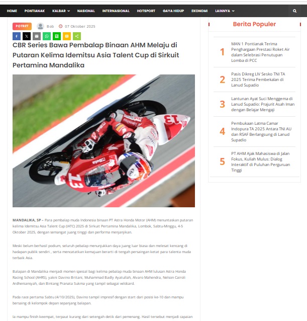 CBR Series Bawa Pembalap Binaan AHM Melaju di Putaran Kelima Idemitsu Asia Talent Cup di Sirkuit Pertamina Mandalika by masmul 7 Oktober 2025 in Silahkan kunjungi https://www.suarapemredkalbar.com/read/potret/07102025/cbr-series-bawa-pembalap-binaan-ahm-melaju-di-putaran-kelima-idemitsu-asia-talent-cup-di-sirkuit-pertamina-mandalika. You Might Like Regional Public Launching New ADV160 The SUV Pride Grand Launching New PCX 160 Truly Exceptional! Tetap hati-hati ya bro sist berkendara saat hujan.